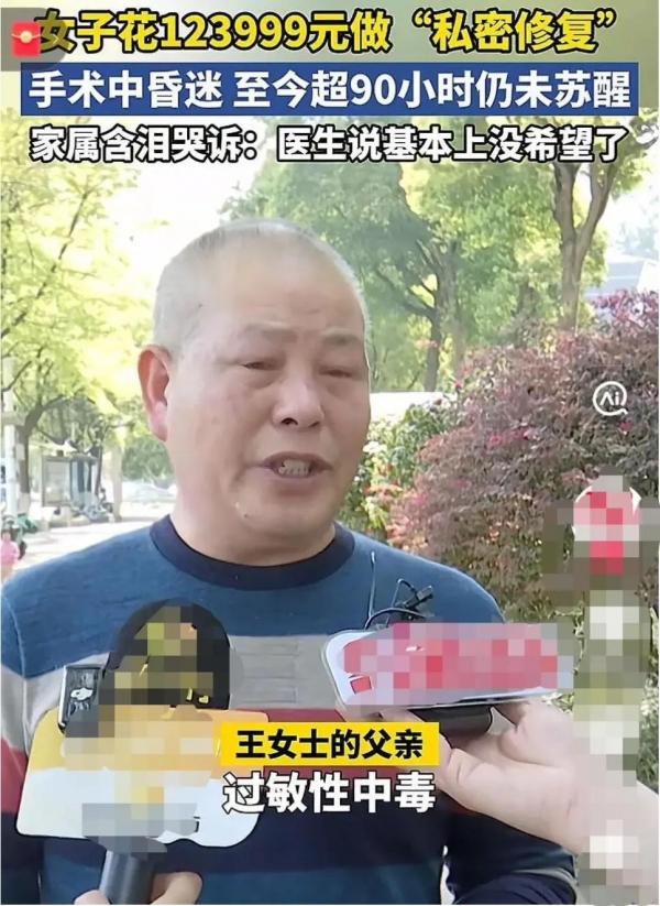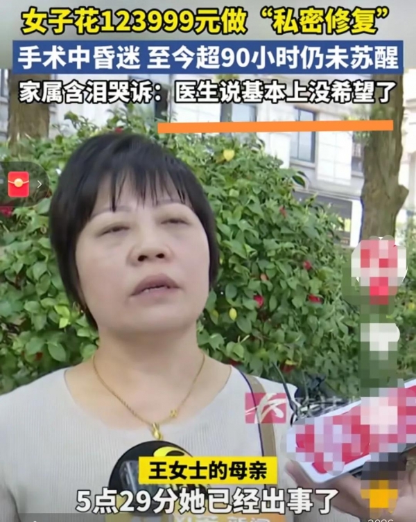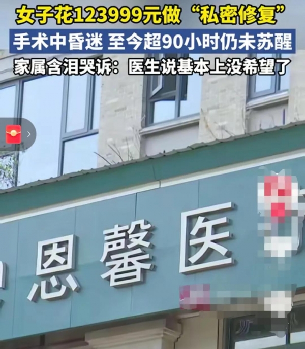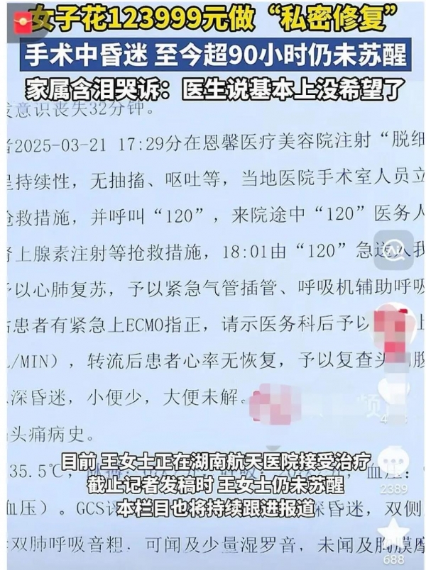 3月21日下午ღ✿✿,王女士总共向恩馨医疗支付了123999元ღ✿✿,手术从下午4:19分开始ღ✿✿,下午5:29分王女士就昏迷了ღ✿✿。目前已转入湖南航天医院进行紧急救治ღ✿✿。