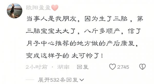 一位疑似王女士朋友的网友说ღ✿✿,王女士因为三胎宝宝8斤多顺产ღ✿✿,信了月子中心推荐的地方才做了产后康复ღ✿✿,造成现在的结果真是太可怜了ღ✿✿!