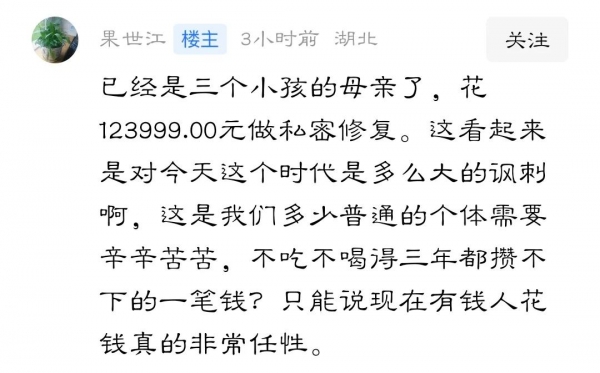 有网友说ღ✿✿,已经是三个孩子的母亲了ღ✿✿,何必再去花钱做这些?这笔钱对如同百姓来说ღ✿✿,不吃不喝好几年还不一定能攒的下ღ✿✿,真是粉刺啊ღ✿✿!只能说有钱任性ღ✿✿!