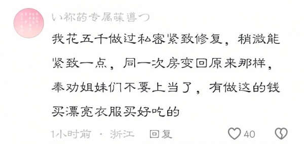 也有网友说ღ✿✿,我也花钱做过私密修复ღ✿✿,刚做完有点效果ღ✿✿,但之后还是会变回原来那样Wepokerღ✿✿,奉劝姐妹们不要上当了ღ✿✿,有这些钱还不如买点漂亮衣服和好吃的ღ✿✿。